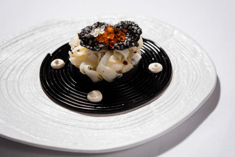 The seabed is an attractive platter that allows our guests to literally smell the sea. It contains dry ice that spills into the clear, fragrant sea in a glass vessel. We serve raw fresh white fish, tuna and oysters on the glass placed over the vessel. The dish is served with various herbs that grow by the sea and creams made from those herbs..
