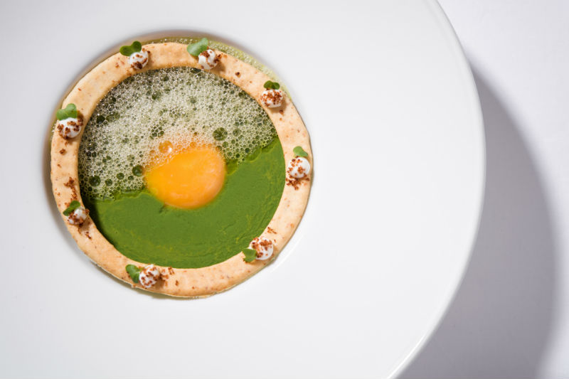 Wild asparagus has traditionally been prepared in two ways in the region. It is either cooked or fried in an egg omelet. We serve the asparagus with eggs as well, but we also use the tips to make a first-rate soup. We dip a sous-vide bio egg in the soup, rim it with lamb rinds and add subsequent layers of fresh cheese cream and dry lamb powder..