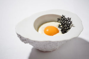 Wild asparagus has traditionally been prepared in two ways in the region. It is either cooked or fried in an egg omelet. We serve the asparagus with eggs as well, but we also use the tips to make a first-rate soup. We dip a sous-vide bio egg in the soup, rim it with lamb rinds and add subsequent layers of fresh cheese cream and dry lamb powder..